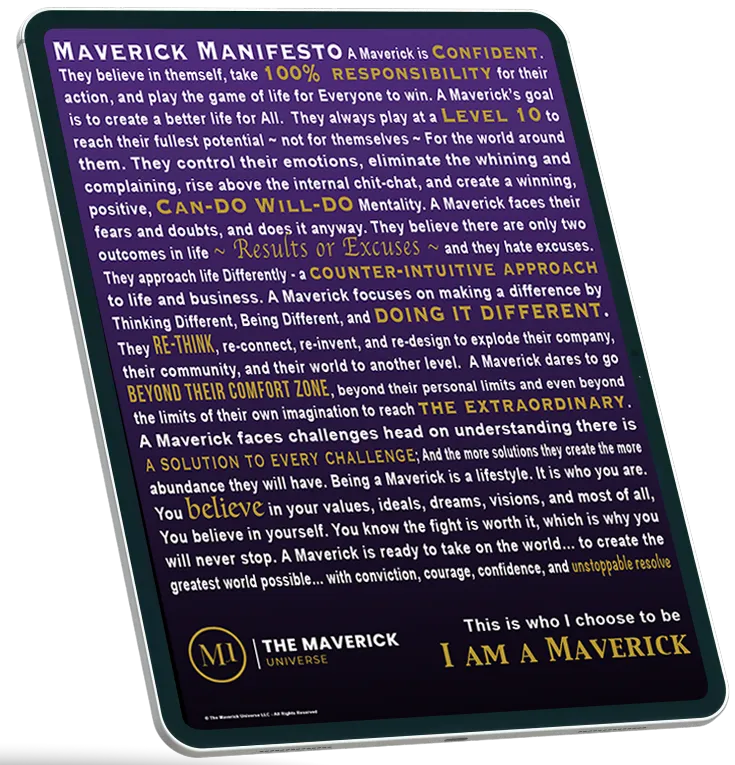 Maverick Manifesto - Discover the exact mental framework used by an entrepreneur with 40 years of experience $50M+ in info products sold, and $30M+ in real estate transactions all while raising 6 kids. This isn't motivation fluff. It's the psychology-backed blueprint for thinking differently than 97% of entrepreneurs still grinding without results.